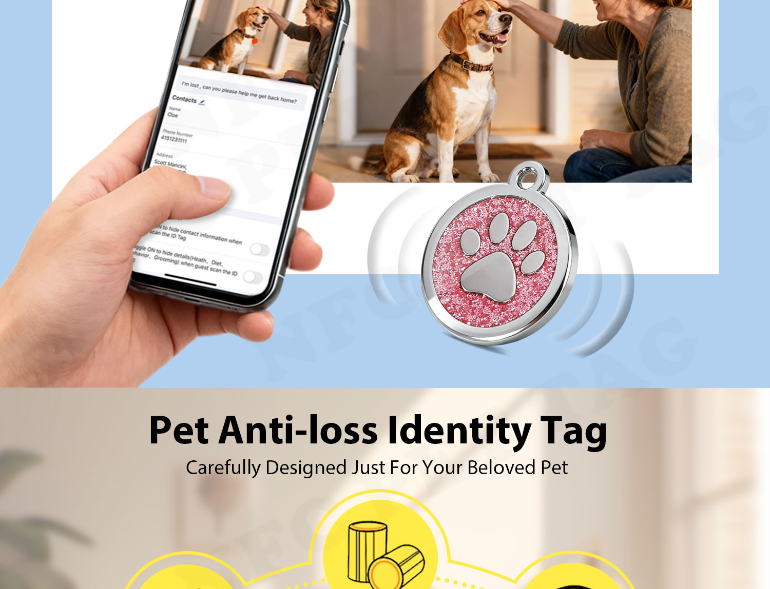 | Applications | NFC pet tags for pets lost and found,etc |