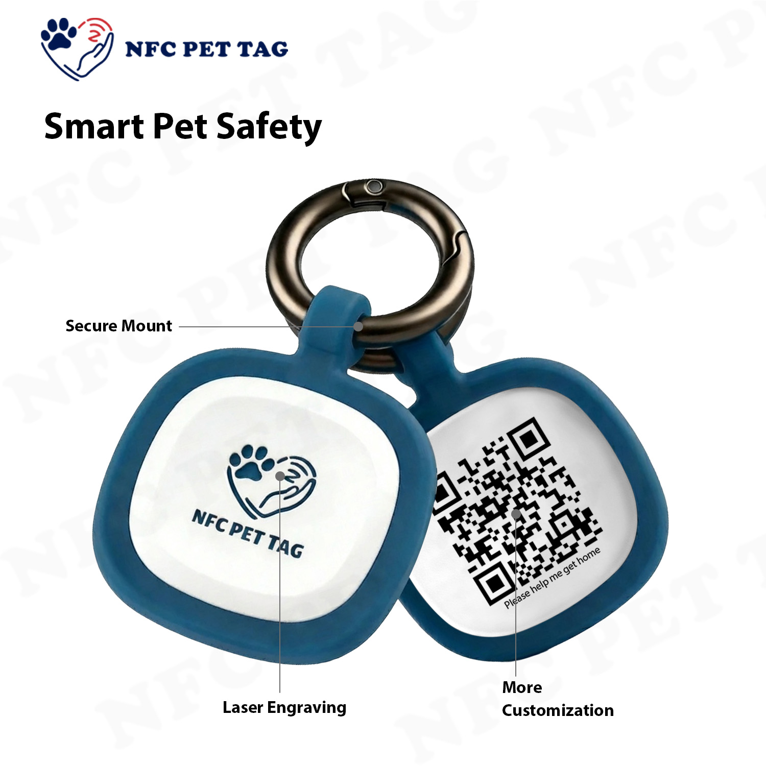 | Advantags | Engineered for high-energy pets, our NFC silicone pet tags deliver unbeatable durability and seamless smart identification for all daily and outdoor use. Constructed from premium scratch, water and impact-resistant silicone, the tags feature permanent shape retention and color fastness—100% fade-free, rust-free, even under extreme daily wear. Laser-engraved QR codes are fully encapsulated in silicone for maximum protection, supporting one-click scanning with all smartphones, no auxiliary tools or app installation needed. The tag syncs with a cloud-based updatable digital profile, enabling real-time edits of contact information and pet medical data from any device, for effortless, on-the-go pet traceability. The robust silicone casing ensures unobstructed QR code scanning even in harsh conditions—mud-caked, water-soaked or scuffed, the code remains readable. In the event of a pet going missing, finders can scan the code for instant one-touch contact via call or message, streamlining a rapid, safe reunion process. |