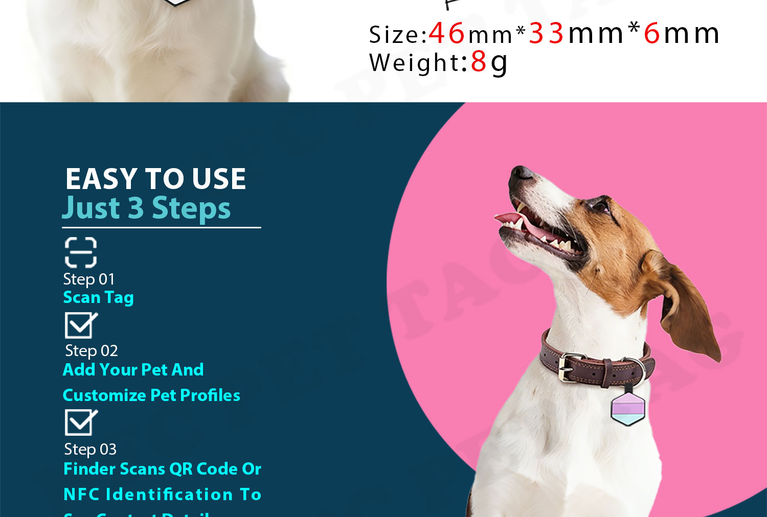 Boasting a lightweight, mini design, this NFC silicone tag fits seamlessly on all collars—from large dog harnesses to tiny cat collars and even bunny vest straps. It adds almost no extra weight, so your pet won’t feel burdened during runs, jumps, or naps, making it ideal for pets of all sizes and activity levels.